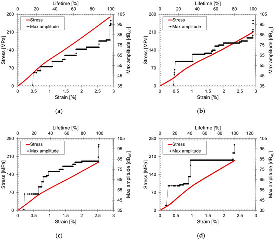 Stress–strain response of GFRP specimens and maximum AE amplitudes after UV irradiation for (a) 0 h, (b) 100 h, (c) 200 h, and (d) 300 h.
