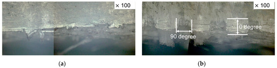 Figure 6 shows the UV effects for 0 h and 300 h irradiated specimens. The fracture surface in Figure 6b shows a serrated fracture surface with many transverse surface cracks. In a woven textile composite, cracks are first induced in the weft direction (transverse cracks), followed by fiber breakage. The pristine specimens (Figure 6a) showed brittle failure according to the typical failure behavior, whereas the irradiated specimens showed more complex crack behaviors. The phenomenon can be explained by surface hardening and surface cracking, as discussed in previous research [31]. In the 300 h specimen, surface crack leads to larger transverse cracks in the early stage (Figure 5d), and the damaged surfaces and interfaces are weaker than in pristine specimens. The cracks propagated more actively (more AE signals with larger amplitude), creating a serrated fracture surface.