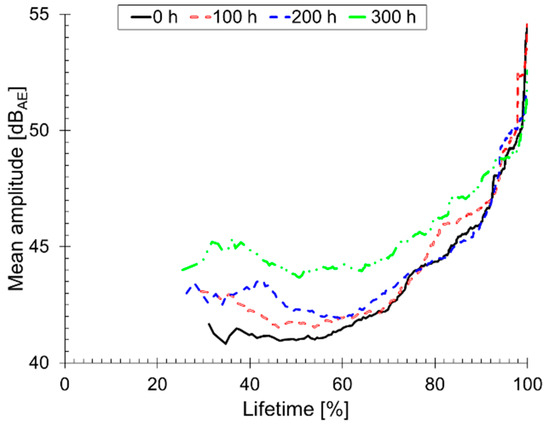 Figure 7 shows the mean amplitude of the AEs. To compare crack behavior among different test times, this was expressed as the percentage of lifetime (where final failure = 100%). The mean amplitude displayed a similar increasing trend in all specimens but was higher in UV-irradiated specimens. As noted above, hit amplitude was strongly correlated with crack size, and a higher mean amplitude implied that the cracks were larger, even at an early stage. Crack growth was faster in UV-treated specimens, and not only in terms of maximum amplitude. In the case of the woven FRP, the load was transferred to longitudinal fibers (0°) after transverse fiber (90°) fractures, and the cracks propagated. When the epoxy was photodegraded by UV light, transverse cracks were initiated, and propagated under low tensile loading via surface cracks and their connections.