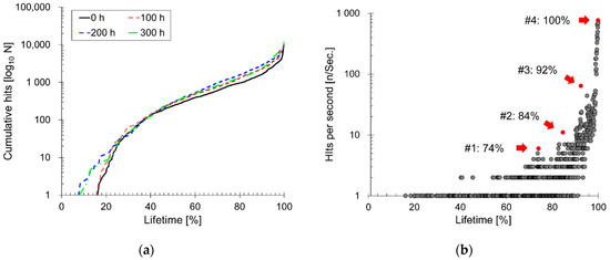 Figure 8a presents the cumulative AE hits. As photodegradation progressed, the time to crack initiation decreased. Note that small microcracks can occur before the first AE hit because a hit is recorded only when a signal exceeds the threshold. The time of the first hit is important because it represents the rate at which the cracks reach a specific size. The trend in cumulative hits was similar after approximately 30% of the lifetime. Figure 8b shows the number of AE signals per second (one black dot corresponds to the number of AE signals that occurred in 1 s). High hit-per-second peaks are labelled #1–4. The maximum amplitude changed according to the hits per second (Figure 5a). It is well-known that cracks do not always grow at a constant rate, and there are regions where the cracks grow suddenly depending on the fiber structure. The AE test results indicate that these regions can be detected by amplitude analysis.