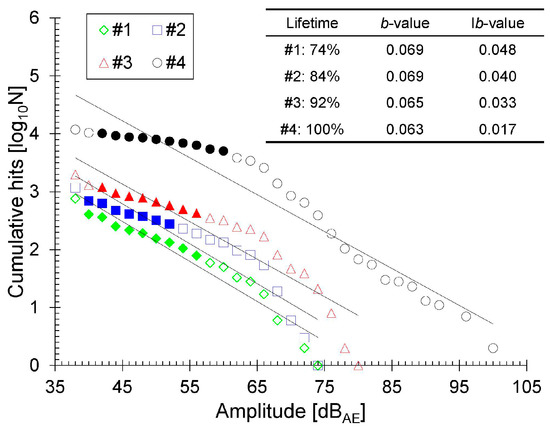 where A is the amplitude of the AE in decibels (dBAE), N is the total number of AE hits, a is an empirical constant, and b is the slope of the linear relationship. The amplitude is a direct indicator of damage. As a macrocrack propagates, high-amplitude signals are generated and the b-value decreases (Figure 4; note the slope of the black line).