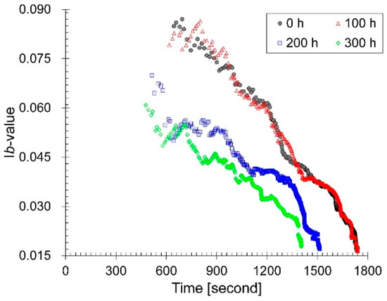 Figure 10 shows the Ib-values over the lifetime of the specimens. The parametric values were calculated after successive generation of 10 AE hits (e.g., 1st–10th, 1st–20th …1st–100th). The Ib-values continued to linearly decrease until the end of the experiment. The maximum Ib-value in the experiment corresponded to the beginning of crack growth, and the minimum value corresponded to specimen failure. The trends were quite similar between the 0 and 100 h specimens, but the starting Ib-value was lower for the 200 and 300 h specimens. Notably, the Ib-value behavior of all specimens linearly decreased and converged to the same value at final failure. Thus, the behavior of an environmentally degraded GFRP can be predicted based on the Ib-value behavior of the pristine specimen.