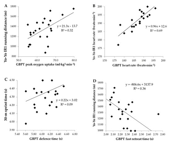 To further analysing the results in the between test correlations, linear regression plots were made between Yo-Yo IR1 running distance and VO2-peak in the GBPT (A), between Yo-Yo IR1 HR and HR in the GBPT (B), between 30-m sprint time in the SSPT and GBPT defence time (C) as well as between Yo-Yo IR1 running distance and fast retreat time in the GBPT (D), which are shown in Figure 2.