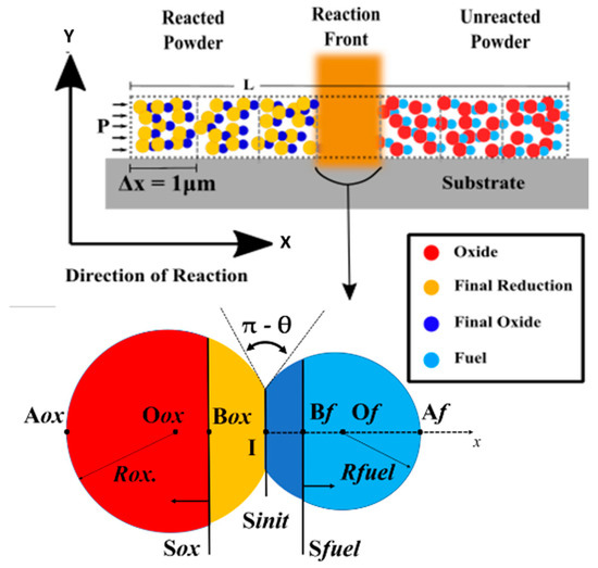A contact angle θ fixed at 135° (see Figure 1, lower scheme) is chosen to represent the degree of coalescence (sintering) of the two adjacent spherical fuel and oxidizer nanoparticles before combustion starts. This value was observed for usual experimental conditions in Al/CuO nanopowders [38,52].