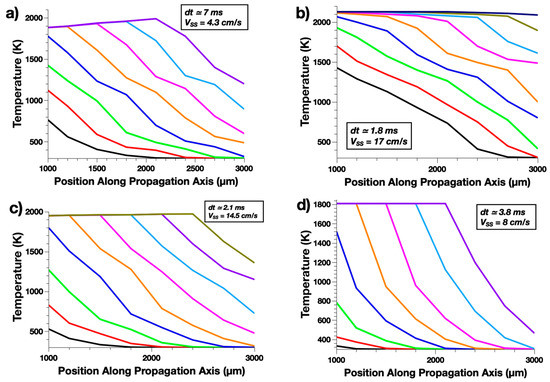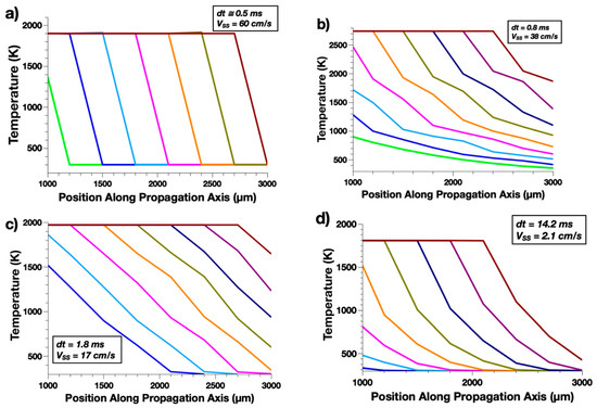 Temperature profiles taken at regular time intervals dt and calculated burn rate VSS for: (a) Al/CuO, (b) Al/Fe2O3, (c) Al/WO3, and (d) Al/Pb3O4.
