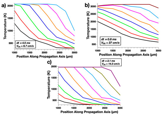 Furthermore, the Al/Fe2O3 system has a calculated burn rate in the same range (slightly lower) as the Al/CuO case with a value of 38 cm·s−1, with well-established steady-state propagation (see Figure 3b). Considering the lower enthalpy of reaction (281.7 kJ per oxygen atom) compared to that of Al/CuO (397.5 kJ per oxygen atom), some other effects are probably playing an active role in sustaining a relatively high flame velocity (the second highest value of all tested thermites after Al/CuO). On the one side, Al/Fe2O3 combustion can endure a much higher flame temperature due to the high disruption temperature (Al vaporization), which de facto increases all mechanisms kinetics; this effect of the disruption temperature increase leading to a higher burn rate is well-documented in Reference [49] for nanothermites in the form of nanolaminates. On the other side, the thermal conductivity is approximately three times that of Al/CuO, which causes preheating of the non-reacted thermite during the long period of initiation. This process is clearly visible in Figure 3b, as a spatial spreading of the flame front temperature is visible in comparison to that of Al/CuO. For Al/Fe2O3, the flame extends over ~800 µm while it is only of 200 µm for Al/CuO (defined as the spatial extension between temperature at its maximum and its upfront thermalization, at a given time of the steady state propagation). To quantify the role of this later process, we artificially reduce the conduction of iron oxide-based thermite to the value of Al/CuO. The calculated burn rate of this Al/Fe2O3 thermite with λAlCuO is 19.7 m·s−1, roughly one-third of the Al/CuO thermite burn-rate, and with minimal change to the initiation delay. Importantly, this indicates that conductivity, rather than the flame temperature, allows a reasonably high burn rate in Al/Fe2O3.