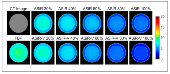 In order to assess the spatial nonuniformity degree of N-FBP, N-ASiR, and N-ASiR-V maps, the nonuniformity index (NUI) [67], as proposed by the AAPM Task Group 233 report [65], was employed. Specifically, for both the CTP486 and CTP404 modules, the entire inner part of the phantom (diameter, 15 cm) was divided into k = 249 ROIs (size, 8 mm × 8 mm). Then, for each map (N-FBP, N-ASiR, and N-ASiR-V), the NUI was calculated as: