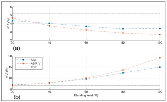 As shown by PDN-ASiR-V and PDN-ASiR maps of the homogenous CTP486 module (Figure 3), when compared with conventional FBP, both ASiR and ASiR-V allowed a substantial noise reduction in CT imaging. In this regard, noise values in the CT imaging of the homogenous CTP486 phantom module are reported in Table 2 for FBP, ASiR-V, and ASiR. The percentage difference between noise in the FBP-reconstructed CT image and that in both ASiR-V- and ASiR-reconstructed CT images increased with increasing blending level, up to 64% and 53% for ASiR-V and ASiR, respectively (Figure 6). Except for the lowest blending level of 20%, ASiR-V presented greater noise reduction potential than ASiR (Figure 6).