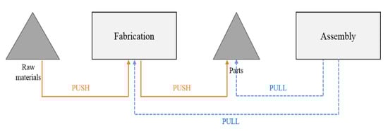 As consequence, many companies tried to adopt some strategies to mitigate this problem. A possible strategy is to apply for the parts with these attributes an MTO-Pull production policy instead of an MTS-Push policy. The result will be a hybrid Push/Pull policy applied to the internally manufactured parts used in assembly (Figure 1). As demonstrated by many studies in the field [,,], in recent years industrial companies are moving toward the implementation of hybrid MTO/MTS production strategies. Technological developments in manufacturing systems increasingly allow companies to manufacture different products on the same production facility with hybrid approaches []. For example, low-valued, standardized products will often be made to stock, allowing demand to be satisfied instantly. For high valued products with irregular demand, stocking can be expensive or even impossible, and these are typically produced to order [].