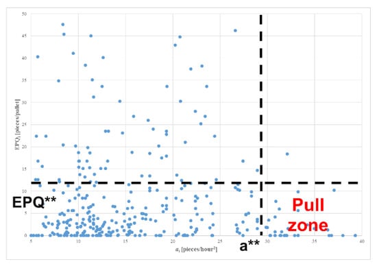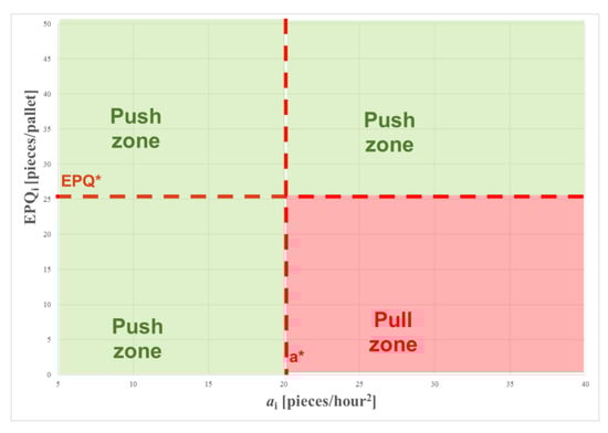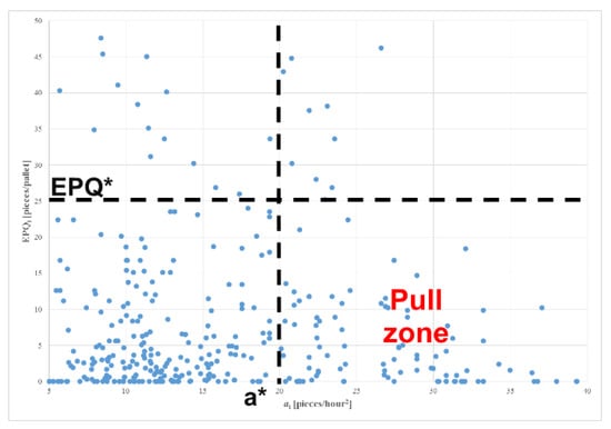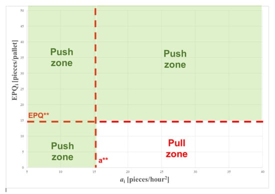 STEP 4. Final PUSH/PULL policy definition. In this stage, according to the breakeven optimal values of a** and EPQ**, it is possible to define the optimal PUSH/PULL policy to adopt for each part i. Figure 10 reports the case study values of a** and EPQ** compared with that of the different parts ai and EPQi, with related optimal PUSH/PULL policy to apply.