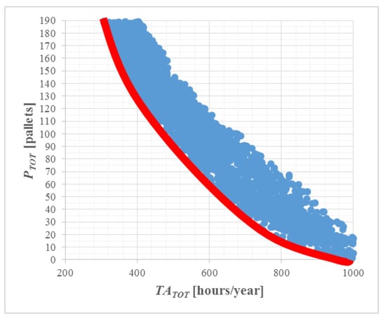 Figure 4 conceptually reports the Pareto Frontier (red curve) of the different scenarios analyzed in the Step 2 with the points. The set of the points belonging to the Pareto Frontier are defined as .