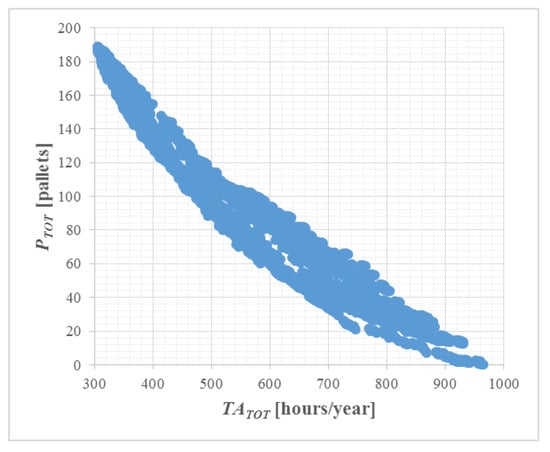 As by Equation (7), the number of stored EPAL is set to 0 in case of MTO policy application. Otherwise, it is set to the ratio between the average batch dimension, i.e., , and the equivalent pallet quantity, i.e., , in case of MTS policy application.