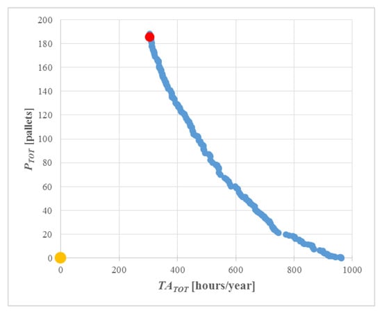 Figure 9 reports the Pareto Frontier of the case study, the set of solutions where no other solution dominates them. At this stage, the decision maker needs to select an optimal bi-objective solution among the set of dominant points. To find the bi-objective optimal point, the minimization of the Euclidean distance between the Utopia point and the points belonging were applied Equation (11). In Figure 9, the bi-objective optimum point (in red) within the Pareto frontier (in blue) compared to that of the Utopia point (in yellow) is reported.