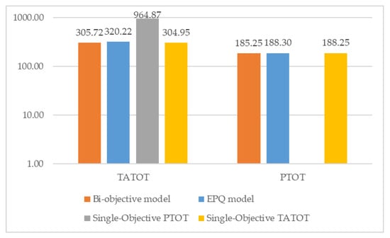 To validate the proposed approach, the case study data are used, comparing the obtained solution toward a milestone MTO/MTS production method: the economic production quantity []. The economic production quantity model (EPQ) determines the quantity a company needs produce to minimize the total inventory costs by balancing the inventory holding cost and average fixed ordering cost. The formulation of the EPQ is known and not reported in the paper for the sake of brevity.