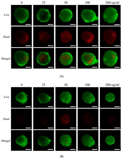 A Live/Dead kit assay was used to determine the viability of the stem cell spheroids after incubating the samples for 50 min upon addition of 0.049% of component A (calcein AM), 0.199% of component B (ethidium homodimer-1), and 99.75% of Dulbecco’s phosphate-buffered saline on Days 1, 4, and 7. Qualitative cellular viability results were obtained using a fluorescence microscope (Axiovert 200, Zeiss, Germany) [16]. Three spheroids were analyzed for each group at each time point.