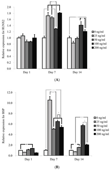 Various attempts have been made to evaluate or suggest the optimal concentration of CTGF [28,29]. One study found CTGF in 10% of basal tears, with a maximum level of 17 ng/mL [30]. CTGF was detected in the subretinal fluid of all research cases at a mean concentration of 10.1 ± 3.68 ng/mL [28]. Another study evaluated the effects of CTGF on type I collagen transcription in quiescent hepatic stellate cells at concentrations of 10, 50, and 100 ng/mL for 16 and 48 h [29]. Incubation for 16 h did not produce any notable difference, but significant increases in collagen transcription were seen in the 50 and 100 ng/mL CTGF groups after 48 h. In the present study, the highest values were seen at 200 ng/mL for alkaline phosphatase activity and Alizarin Red S staining. qPCR results showed the highest expression of RUNX2, BSP, OCN, and COL1A1 at 100 ng/mL group. Our study shows some similarity pattern of previous report, which evaluated osteogenic capacity of elderly osteoblasts in three-dimensional cultivation. It showed that expression of OCN was in high level on Day 0, which went down and rose again [31].