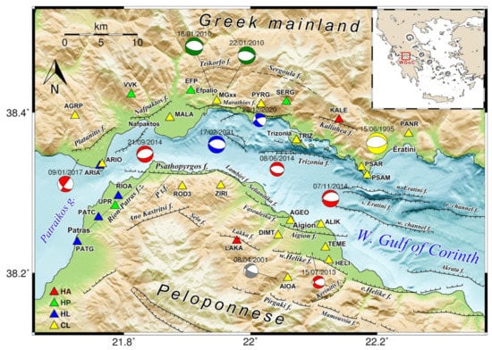 Seismotectonic map of the Western Gulf of Corinth (WGoC; location marked by the red rectangle in the inset map). Beachballs depict the focal mechanisms of significant earthquakes: red after NKUA-SL, blue after GI-NOA, green for the 2010 Efpalio earthquakes after [29], yellow for the 1995 Ms = 6.2 Aigion earthquake [11] and gray for the 2001 Agios Ioannis Mw = 4.2 event [3,4]. Triangles depict seismological or accelerometric stations that operated during the study period (2013–2014), with colours corresponding to different network codes (legend at the bottom-left). Fault lines after [4,12,15,16,17,30]. Pt.f.: Panachaikon transfer-fault.
