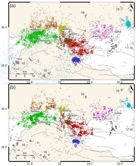 Seismicity of years 2013–2014 in the Western Gulf of Corinth (a) before and (b) after relocation with HypoDD. Different colours and numbers represent the 9 spatial groups to which the dataset has been divided, in addition to the “miscellaneous” group (#10), presented in gray.