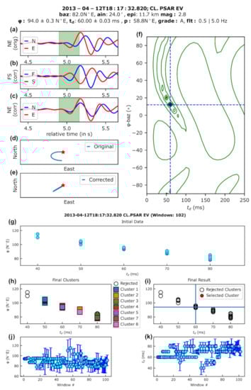 Example of the automatic determination of the SWS parameters with the Pytheas software, using the Eigenvalue (EV) and Cluster Analysis (CA) methods. Horizontal recordings (a) in their initial N-S/E-W co-ordinate system (N-E), after the application of band-pass Butterworth filter between 0.5 and 5.0 Hz, (b) rotated into the Sfast/Sslow co-ordinate system (F-S), having measured φ = N94°E, then shifted Sslow leftwards by td = 60 ms and (c) rotated back to the N-S co-ordinate system, after being corrected for anisotropy, where the p = N58.8°E polarization direction is measured. The S-wave particle motion in the N-S co-ordinate system is also presented in the hodograms of panels (d) for the initial waveforms and (e) after correction for anisotropy. (f) Contours of the distribution of λ2 values during the grid-search of (φ, td) pairs performed for the application of the EV method, with the polarization direction displayed in the form of φ-baz, i.e., degrees relative to the back-azimuth, wrapped in a range of ±90° with respect to the R-axis direction. The selected (φ, td) pair, corresponding to the global minimum of λ2, is marked by the dashed cross-hair, pointing to the middle of a dark-shaded region that indicates the 95% confidence interval for λ2 [42], from which δφ = 0.3° and δtd = 0.03 ms are measured. (g–k) Diagrams of the Cluster Analysis (CA) method for the determination of the best window presenting: (g) the (φ, td) measurement pairs, (h) the performed clustering, (i) the selection of the most constrained cluster and measurement with the smallest errors, (j) the series of φ and (k) the series of td measurements per trial window index, with their respective uncertainties.
