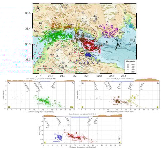 The westernmost part of the Nafpaktos-Psathopyrgos group #4 (green), activated after the 21 September 2014 Mw = 4.6 event, could possibly be associated with the Rion-Patras SW-NE-trending dextral oblique-normal fault zone, or with related sub-parallel structures dipping towards NW. The N10°E cross-sections of Figure S13 imply gradual deepening of seismicity towards the western profiles, which is also highlighted in Figure 4a1–a2, as well as in the N315°E-oriented cross-sections of Figure S14 and the N100°E-oriented cross-section of Figure S15. However, the focal mechanisms associated with the larger offshore events of group #4 (e.g., the 21 September 2014 Mw = 4.6 earthquake) suggest an E-W to WSW-ENE-striking fault. The latter, along with the hypocentral distribution, could indicate an association with the Ano Kastritsi fault, further south. The two available focal mechanisms for events below Platanitis support SW-NE faulting, with one being normal and the other dextral, both compatible with the kinematics of the Rion-Patras fault zone.