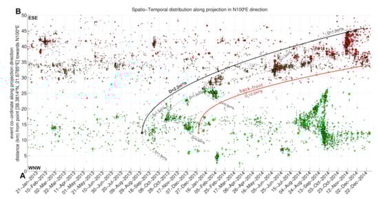 where td is the duration of the injection and Db the hydraulic diffusivity corresponding to the back-front. In Figure 6, a back-front curve of Db = 2.2 m2/s is shown with a bold red line, beginning ~120days after the initiation of the triggering front at point Y ≈ 12 km on 1 September 2013. In that case, the post-injection hydraulic diffusivity is the same, considering pore-pressure diffusion in three dimensions (Equation (2); [51]).