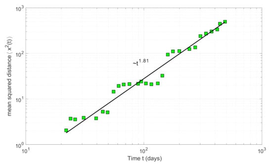 where xn(t) is the distance of the nth event from the reference point at time t and N is the total number of events. The result is shown in Figure 7 in double-logarithmic axes and logarithmically spaced bins. The overall growth of the msd with t signifies the diffusive process. This growth is not continuous, but rather evolves in sequential “steps”, as observed after the passage of ~50, 130, 272 and 418 days (Figure 7). These days mark the activation of the sequential seismic clusters in groups #4, #6 and #8 towards the east, within the parabolic envelope defined in Figure 6. On the other hand, during the in-between time periods, the msd is almost constant or grows slowly with t. The overall scaling behavior of the msd with t can be approximated with Equation (3), yielding a diffusion exponent a = 1.81 ± 0.17 (R2 = 0.98). In terms of the Continuous Time Random Walk (CTRW) model (e.g., [55]), this value of the power-law exponent indicates super-diffusion. Compared to the range of exponents reported in the literature that mainly correspond to slow earthquake sub-diffusion [49,56,57,58,59,60], the diffusion exponent in this case is significantly larger and comparable to that reported by [61]. Hence, the large diffusion exponent likely corresponds to large rates of earthquake migration triggered by aseismic factors, such as pore-pressure diffusion or aseismic creep.