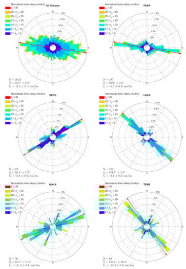 The distribution of the fast shear-wave polarization direction (φ) measurements from Cat1 for selected stations, representing sites with different average φ directions, is presented in Figure 8 in the form of rose diagrams. The respective diagrams for the rest of the stations are available in Figure S16. Rose diagrams, widely used in shear-wave splitting studies (e.g., [22]), are circular histogram plots which display directional data (in the current case, fast shear-wave polarization direction data) and the frequency of each class, (i.e., the number of measurements for each φ bin). The SWS parameter statistics for Cat1 are presented in Table 2. The average φ value is calculated with circular statistics [62] to avoid wrapping between 0° and 180°. In most stations, the mean value coincides with the direction that corresponds to the larger amount of valid measurements. There are, however, a few exceptions, such as station HELI (Figure S16), which presents two main fast-shear-wave polarization directions, one at ~N30°E and another at ~N100°E. The mean φ in that case was calculated at 77.6° ± 11.6°. However, this value does not correspond to either of the two maxima of the distribution. There are also some stations with significant φ scatter, such as VVK, and certain stations of the Magoula array, i.e., MG03, MG05 and MG07, for which the mean value differs from the azimuth that corresponds to the maximum of measurements. The value of valid measurements for all stations (Cat1) is 98.8° ± 2.8°. Important deviations from this direction are observed for stations LAKA ( = 134.7° ± 5.9°) and TEME ( = 145.1°±16.3°), in the south, and stations SERG ( = 58.4°±7.5°) and MALA ( = 68.1° ± 11.0°), in the north. Stations with significant φ scattering, indicated by the large uncertainty, include MG03 ( = 67.1° ± 30.8°), PANR ( = 132.8° ± 36.6°) and PYRG ( = 142.2° ± 41.6°). The time-delays, td, are partially depended on the spatial distribution of the seismic sources relative to the receiver. Since the time-delay is accumulated along the path-length of the seismic ray as it travels through the anisotropic medium, longer ray-paths will result in larger td values. The time-delays are normalized (tn) by dividing td with the hypocentral distance to remove the effect of the ray-path length. The mean tn values are overall (9.2 ± 0.1) ms/km, while average tn per station ranges from 5.0 ms/km (AGRP) to 12.5 ms/km (ALIK). The raw td measurements have a mean of (112.3 ± 1.4) ms.