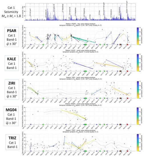 Regarding the temporal variations of the SWS parameters, we take advantage of the large number of measurements from the combination of the manual and automatic catalogues to investigate patterns of change with time. The time-delay between the Sfast and Sslow waves, normalized by the ray-path length, can be used as an indicator for the degree of anisotropy in the medium. However, factors besides the traveled distance also affect td. These include the difficulties in the precise measurement of φ or td related to the radiation pattern (focal mechanism), the distortion of polarization due to non-perpendicularity of the incident seismic rays to the surface, variations in the frequency content between Sfast and Sslow and larger attenuation of the Sslow [44,63], effectively contributing to a significant degree of scatter. To exclude measurements that are less affected by changes in the geometry of the fluid-filled microcracks, we select event-station pairs whose ray-paths belong to “Band-1”. This is defined as the double-leafed solid angle between 15° and 45° on either side of the vertical crack-plane (whose azimuth is defined by ) passing through the station (see Figure S21 for a schematic view of Band-1). Ray-paths of event-station pairs travelling through the ±15° solid angle from the crack-plane are classified as “Band-2” measurements and are more affected by the microcrack density [64]. Optional filters are applied to remove part of the tn measurements, such as those affected by a higher angle of incidence at the surface, having strong spatial dependence or having a lower quality grade. In addition, temporal variations of tn are also examined after discarding results related to φ measurements that significantly differ from the of that station measured from Cat1, which may be potentially erroneous. For events of Cat2 (automatic), we applied a focal depth correction, as their lower quality hypocenters tended to be scattered at much shallower depths than their neighboring events of Cat1, causing inconsistencies in the tn dataset of Cat3. This was performed by applying, for each event of Cat2, the average focal depth of the events of Cat1 with neighboring epicenters (excluding those with Z > 15 km). This modification reduces some outliers in Cat2 that yielded erroneously high tn values due to the shorter distance (shallower depth). Small fluctuations of ±1 km or even ±2 km from that average depth don’t seem to affect the measured tn significantly, as the resulting changes are much smaller than the observed measurement scatter.