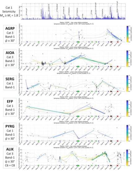 The comprehensive dataset of shear-wave splitting parameters of the present study may provide evidence regarding changes in the local stress field, fluid diffusion or saturation that can affect the anisotropic properties of the medium. Previous upper-crust anisotropy studies in the WGoC have focused in the 2010 Efpalio sequence [74], the 2013 Helike swarm [75] and the November 2014 sequence [48]. Their findings indicate that the fast shear-wave polarization directions are consistent with the maximum horizontal stress component, σHmax (e.g., [76]), which is in a WNW-ESE direction, parallel to the strike of major normal faults. Herein, the obtained mean φ directions are collectively presented in Figure 10. Notably, the results of the automatic analysis are, on average, consistent with those of [48,75], who performed manual SWS measurements through visual inspection of polarigrams and hodograms. In the following, the presented average values of the SWS parameters are from measurements of Cat1, unless specified otherwise. These measurements concern the volume between the sources and the receiver as sampled by the seismic ray-paths, whose length is used for the normalization of the time-delays.