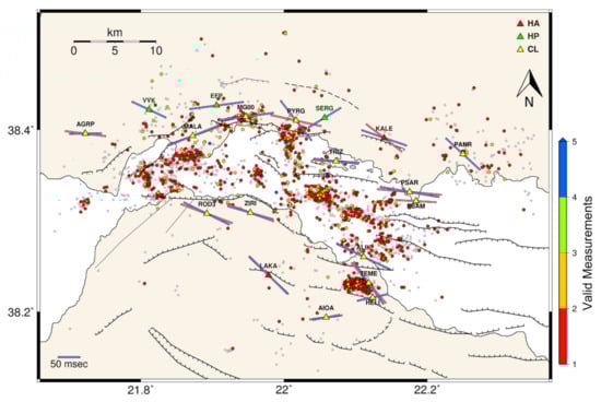 An important advantage of the Pytheas software is that it permits fully automatic SWS processing by defining the optimum S-wave signal window. This is performed with the application of a Cluster Analysis procedure [45]. A series of different window configurations are examined, within the bounds of the middle of S-P interval and the dominant period of the S-wave pulse multiplied by a user-defined factor [39,40]. For each window, φ and td are measured using the EV method and the solution pairs are sorted into clusters [45]. Then, the window yielding the (φ, td) solution pair with the smallest errors from the most constrained cluster is selected. The quality of the SWS parameter measurements is assessed by automatically calculating a score value, taking into account the ratio between δφ or δtd and a respective user-defined maximum threshold. A quality grade between A (best) and E (worst) is then attributed, depending on their resulting average score. The E grade is also reserved for cases of low SNR < 1.5. In the following, only measurements with grades A, B or C were taken into consideration. Furthermore, measurements are marked as “null” when their φ value is within ±10° from p or p + 90°, i.e., sub-parallel or perpendicular to the polarization direction, p, of the corrected (for anisotropy) shear-wave. In those cases, it is not possible to distinguish whether the medium is isotropic or the initial polarization coincides with that of the Sfast or the Sslow, which is why “null” measurements are discarded [46].