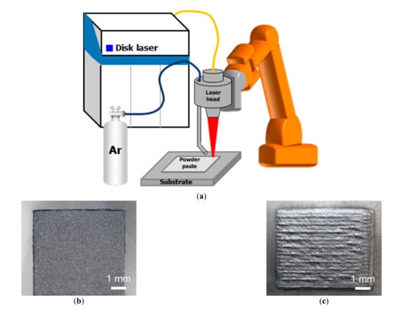 (a) schematic of the experimental setup. (b) HEAs powder dried on the substate before laser cladding. (c) Coating layer appearance after laser cladding.