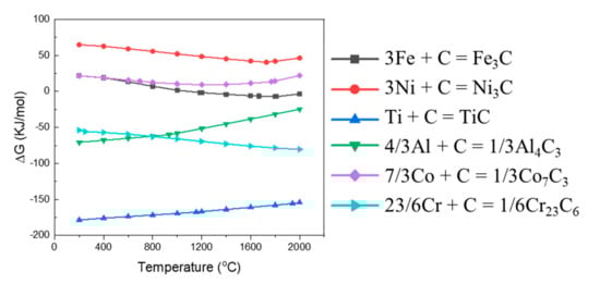 Thermodynamics calculations by the Factsage® software (CRCT group at Ecole Polytechnique de Montreal, Canada) developed by the CRCT group at Ecole Polytechnique de Montreal were used to design the reinforcing phase by simulating the reaction of various alloying elements with the carbon from the binder and powder. The software calculated the equilibrium phase and thermodynamics parameters for a variety of multi-component, multi-phase, and reactions. The Gibbs free energy for the formation (ΔGf) in Figure 2 shows the most stable carbide among the reactions between the metal elements and one mole of carbon. When using FeCrCoNiAlTiC powder, it was necessary to confirm whether titanium carbide was a thermodynamically stable carbide in the in situ reaction. The powders were mechanically alloyed and could be assumed to be completely homogenized. Laser cladding is a non-equilibrium reaction with very fast temperature changes, which melts the powder and then solidifies rapidly. Non-equilibrium phases could also be precipitated, but the most thermodynamically stable phase is preferred. As a result of the calculation, TiC was found to be the most stable phase among the alloying elements in this powder, followed by chromium carbide. In Ti-free HEA alloy, the most stable chromium carbide phase except for TiC is formed []. The second stable carbide phase, chromium carbide, is formed when carbon capture Ti element enough and redundant C remains []. Both TiC and Cr23C6 are superior materials that enhance hardness and wear resistance higher than that of a stainless-steel substrate, but TiC had better wear resistance than chromium carbides []. Therefore, the spontaneous formation of titanium carbide instead of chromium carbide by adding Ti to multi-component alloy powders, such as HEAs, is important for the properties of the coating layer.