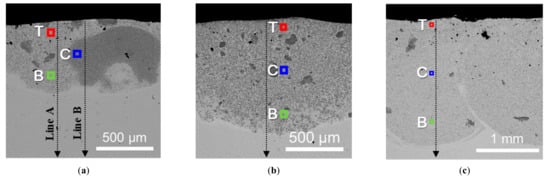 Cross-section image of coating layer (a) EEMMC1.0, (b) EEMMC1.5, and (c) EEMMC2.0. The squares represent the locations where the magnified microstructure images were taken, and the dotted lines are hardness measurement positions, which are employed in the following figures.