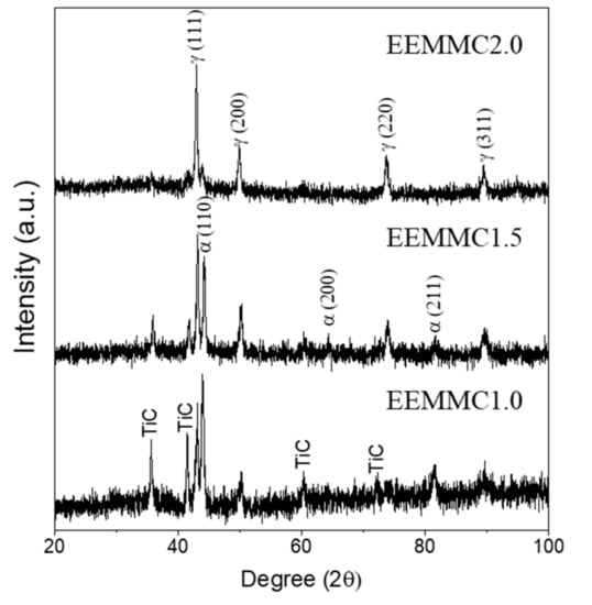 Figure 4 shows the XRD results for the phase analysis of the specimens. EEMMC1.0 detected three phases of TiC, gamma phase with a FCC structure, and an alpha phase with a BCC structure. The carbide formed in the coating layer in this process was TiC, which was consistent with the predicted stable equilibrium phase by thermodynamic calculations. The higher the laser output, the more the dilution with the substrate increased. The substrate AISI 304 stainless steel consisted of Fe-Cr-Ni as the main components and had a gamma phase. Therefore, the effect of increasing the content of Fe, Cr, and Ni should be investigated. In Fe-TiC alloy, secondary phases, such as Fe2Ti, are generated []. When Ni is added, Ti2Ni, NiTi, and Ni3Ti are developed [,], and Cr2Ti is detected in Cr-Ti []. Because the metal matrix has a high configurational entropy and a fast cooling rate from the laser process, secondary phases could be suppressed. Therefore, no secondary phase picks were detected in XRD other than the main phases of gamma and alpha. The HEAs powder used in this study is a type 2, which has BCC and FCC phases, with the addition of high atomic radius elements, such as Al and Ti, to a type 1 (only FCC) []. In EEMMC1.5, the TiC peak as a reinforcing phase exists, and alpha and gamma phases are detected as a metal matrix phase. In EEMMC2.0, the TiC and alpha-related peaks almost disappeared, and only the gamma-related peaks developed. This is because the dilution with the substrate increased as the heat input increased.