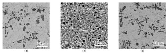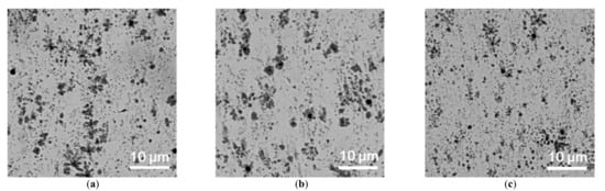 The cladding layers, EEMMC1.0, EEMMC1.5, and EEMMC2.0, were divided into three parts at 0.2-mm, 0.4-mm, and 0.8-mm intervals, respectively, considering the coating layer thickness in the depth direction. The top part (T) close to the surface, the central part (C), and the bottom part (B) close to the substrate were divided. The sample name with the position was indicated by appending T, C, and B after the sample name. For example, the top part of EEMMC1.0 was labeled as EEMMC1.0-T. The microstructure of each section was analyzed by observing the locations marked by boxes in Figure 3. As a result of EDS analysis, the particles with the gray darker than the metal matrix are TiC, and the black particles are Al2O3 in BSE mode images []. Figure 5 shows the microstructure typically shown in the coating layer under the conditions of Figure 3a, and Figure 5a,c are the microstructures from the top and bottom of the coating layer, respectively. As shown in Figure 5a,c, the metal matrix region had a black particle fraction of 14%. The morphology of the particles showed a dendritic structure. Figure 5b shows the agglomeration regions composed of sub-micron-sized TiC and Al2O3.