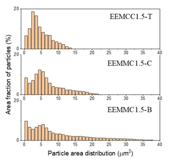 Area distribution of reinforcing particles in EEMMC1.5-T, EEMMC1.5-C, and EEMMC1.5-B.