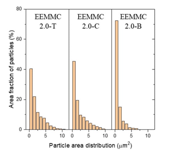 Area distribution of reinforcing particles in EEMMC2.0-T, EEMMC2.0-C, and EEMMC2.0-B.