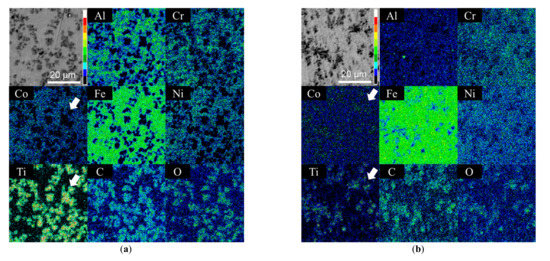 EEMMC1.5-T and EEMMC2.0-T were analyzed by EPMA (Figure 10). In EEMMC1.5-T, the particles consisted of Ti, C, and O, and the metal matrix had relatively high Al, Cr, Co, Fe, and Ni contents. Most of the EEMMC2.0-T showed similar distributions with EEMMC1.5-T, but the cobalt distribution was reversed, which is indicated by white arrows. In EEMMC2.0-T, there was more cobalt content in the reinforcing particles than in the matrix. The high heat input in EEMMC2.0-T dissolved the reinforcing particles and contributed to the diffusion of cobalt from the matrix to the reinforcing particles. The block-shaped particle of EEMMC1.5-T showed a distinct interface, whereas the particle of EEMMC2.0-T had a smooth interface due to diffusion. EDS analysis was measured to analyze the composition of the particles and the metal matrix by separating the particles (P) and the matrix (M) in the microstructure of each top part of the samples. M and P were added after the existing names, and points were used as shown in Table 3. Block-shaped particles had a very high Ti content, close to 90% in the EDS analysis (Table 3), whereas particles with dendritic morphology of EEMMC1.0-T-P and dissolved particles of EEMMC2.0-T-P had a relatively low Ti content.