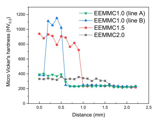 The micro-hardness was measured for each sample shown in Figure 11. All samples were measured along the arrow lines in Figure 3, and EEMMC1.0 was measured at two lines due to its inhomogeneous microstructure. In EEMMC1.0, the maximum hardness of line B where spherical reinforcing particles were aggregated, was 1000–1100 HV, and the hardness of line A was found to be 400 HV. EEMMC1.5 exhibited a 0.9-mm-thick coating layer and a high hardness in the range of 700–900 HV, with values up to 900 HV near the surface. EEMMC2.0 showed a low hardness value of 300–350 HV due to the small particle fraction and the development of a gamma phase with a FCC structure.