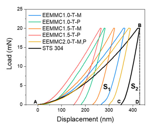 Table 5 summarizes the mechanical properties of the coatings measured by a nano-indentation test. The reinforcing particles of EEMMC2.0-T were too small to measure only the reinforcing particles with a nano-indenter. Since the hardness values between particles and matrix were measured similarly, EEMMC2.0-T-M and EEMMC2.0-T-P were averaged together. From the loading/unloading curves, the micro-hardness (H) and the Young’s modulus (E) were calculated, and the elastic recovery (Es) could be obtained from the area of the graph (Figure 12). Es can be obtained through the value of S2/(S1+S2), S1 is the area inside A-B-C, and S2 is the area inside B-C-D []. Thus, Es means the ratio of elastic strain recovered during unloading to the total energy consumed in plasticity and elasticity during loading, which means resistance to plastic deformation. H/E and H3/E2 are also important values that determine the wear resistance of the coating and resistance to plastic deformation, respectively [,]. Blocky particles of EEMMC1.5-T-P had higher values of factors, such as H, E, H/E, H3/E2, and Es, than particles of EEMMC1.0-T-P and EEMMC2.0-T-P. EEMMC1.5-T exhibited a significantly higher hardness than 900 HV, even with a 30% particle fraction. Therefore, the high hardness characteristics of EEMMC1.5 were obtained, not only from the influence of the fraction of the particles, but also by the excellent mechanical properties of the blocky-shaped reinforcing particles themselves.