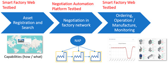 Figure 2 shows the overall workflow of the SFW. In the first step, “Asset Registration and Search”, assets (manufacturing resources such as factories or machines) are registered on SFW with a description of their capabilities. Capabilities can be expressed in terms of what the asset produces (e.g., a computer mouse as a product) or in terms of how the asset produces, processes or transforms a product (e.g., 3D printing, or metal cutting and bending). Registered assets can be searched for on SFW on the basis of their capabilities as well as other metadata such as location. A client of the SFW may search for a set of candidate assets able to perform an overall manufacturing task, e.g., as represented by a supply chain or production diagram. The next step is to negotiate with the candidate assets on delivery terms and conditions such as price, time, quantity and quality. The negotiation procedure may be manual or supported by platforms such as the Negotiation Automation Platform (https://hub.iiconsortium.org/negotiation-automation-platform, accessed on 15 July 2021) of NEC (see Section 7.1) that uses AI techniques to facilitate the solution of the complex multi-constraint, multi-objective optimization problem. The result of this second step is the selection of assets to accomplish the overall manufacturing task. The third step in the workflow comprises the ordering, operation and monitoring of the manufacturing steps in the selected assets. Assets can provide operational reports to the SFW. These can be at machine level (e.g., for quality control or machine maintenance purposes), or simply give the status of the order processing. All three steps may require confidential, commercially sensitive information to be exchanged. The usage control for such information can be specified and implemented with the technologies of the International Data Spaces (IDS) Association [15], such as the IDS Connector [16].