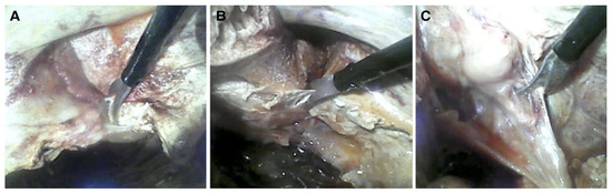Mesorectal excision restricted by rigid straight-light laparoscopic tool. Lateral completion on the right side (A), the left side (B) and the anterior side (C) [3].