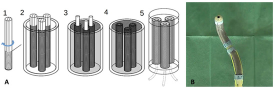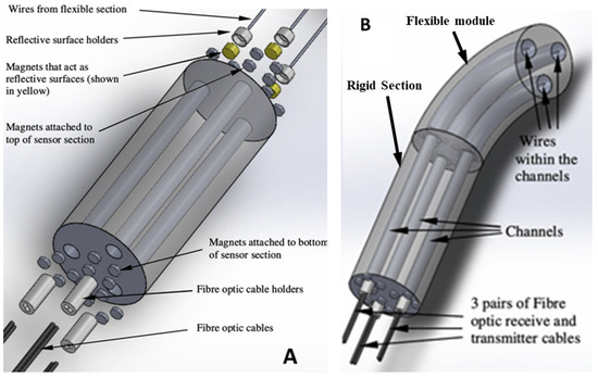 Constituent parts of the test system. (A) The rigid section with the integrated sensing elements; (B) Assembled system comprising the rigid sensor section and the flexible module [38].