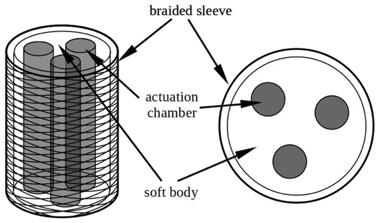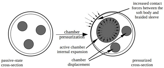 Deformation of module cross-section during actuation. Pressurization of any chamber causes it to expand within the braided sleeve that leads to significant deformation of the cross-section of the module. The deformation includes the expansion of the chamber itself, displacement of other chambers and increased pressure between the silicone body and the sleeve [28].