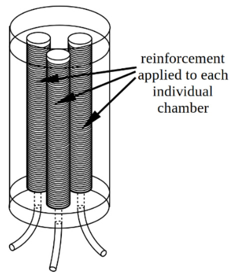 A robust and reliable solution to all the aforementioned issues was to introduce reinforcement directly where it was needed, i.e., around the actuation chambers themselves rather than the overall device, shown in Figure 3A and Figure 8. By reinforcing the pneumatic chambers within the silicone body as close as possible to where the pressure is created, we were able to limit the radial expansion of each individual chamber, without compromising their ability to bend and stretch. Additionally, by directly embedding fibres into the silicone material, we reduced the aforementioned friction issues, and this meant that the shape of the device would be solely a consequence of pressure values in the chambers, uninfluenced by the sequence in which they were activated.