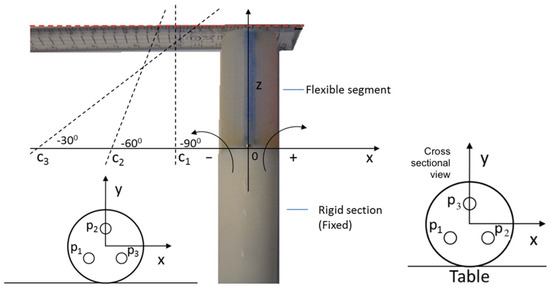 During testing, we mechanically forced the flexible module to assume the bending angles of θ = ±30°, ±60° and ±90°, with direction angle β = 0°. Data from the light intensity modulated sensors were recorded, with channel lengths deduced from changes in reflected light intensity. As a benchmark for validation, the rigid section of the overall system was fixed to a flat tabletop, so that its main axis was parallel to that of the table. This was to keep any bend solely to the x-z plane. A ruler, attached to the top of the flexible module, enabled measurement of the bending angle (see Figure 11), testing angles from −90° to +90° at 30° intervals. Multiple tests (five) for each angle were conducted and the computed averages were used for further elaboration. At each angle, the centres of the bending circle were experimentally determined by finding the intersection between the ruler’s projection line and the x-axis, which was marked out on the tabletop. In order to set each angle, the flexible module was manually manipulated, using the attached ruler [38].