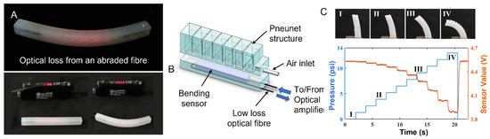 (A) Abraded fibre-based bending sensor shows optical loss through the cladding and decrease in light intensity measured by the receiver corresponds to the bending curvature; (B) Schematic of a pneumatically controlled soft finger sensorized by the fibre-based sensor; (C) (top) the bending shape of the finger under different input pressures and (bottom) the sensor response during the bending process [36].