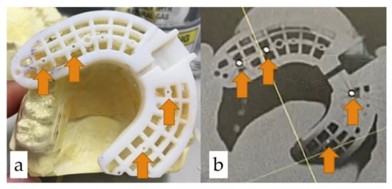 Preoperative procedure: (a) prefabricated thermoplastic stent with fiducial markers (small titanium discs; arrow heads); (b) CBCT image.