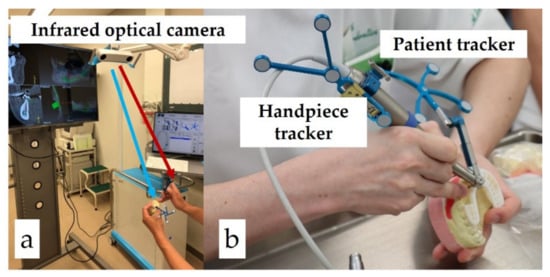 Dynamic navigation surgery for dental implant placement has been increasingly used because it has the following advantages: (1) the availability of immediate placement after planning, (2) on-site alteration of implant placement dependent upon the clinical situation and (3) minimally invasive intervention due to real-time visualization [1,2,3,4]. In general, the workflow of dynamic navigation surgery includes images of cone beam computed tomography (CBCT) with fiducials, virtual planning of implant placement and the use of motion tracking technology for calibration and practical implant placement [4,5,6]. Briefly, fiducial markers, attached to the patient’s jaw during CBCT exposure, are registered in software. These markers and markers on the surgical handpiece are captured with a tracking camera in order to display the relative position of the jaw and the drill (burr) in CBCT images. These provide guidance for freehand real-time drilling and implant placement. This means that data acquisition and registration are the most crucial procedures for accomplishing the ideal placement as planned.