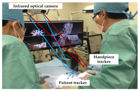 Prior to surgery, the stent with a tracking frame was rigidly fixed at the same position of residual dentition. The tracking frame for the handpiece and the infrared optical camera system were also prepared, and the calibration of these frames were performed in the same manner as for the planning procedure (Figure 3).